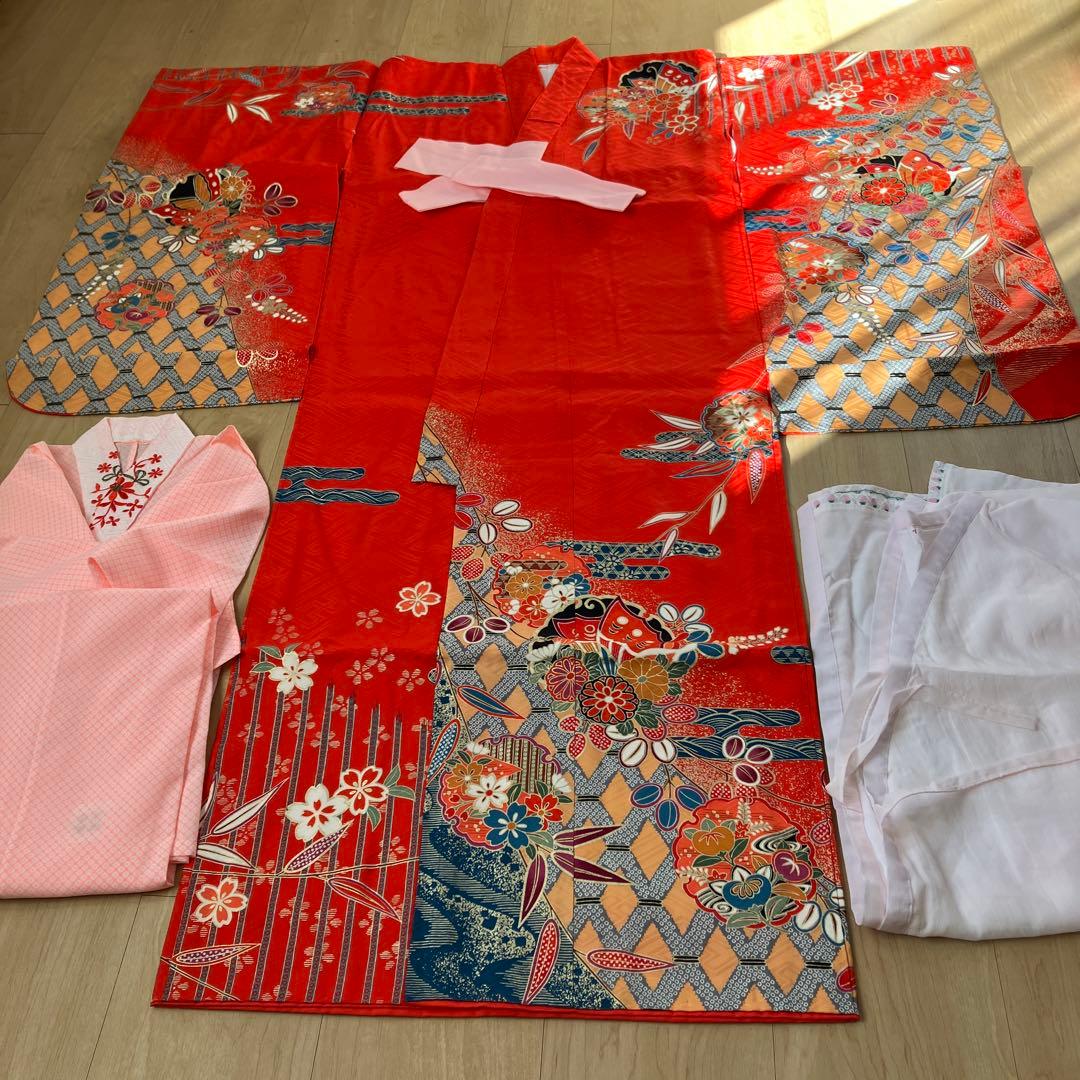 七五三 3歳 女の子 赤 桜 7点セット 着物 被布 長襦袢 足袋 草履 巾着