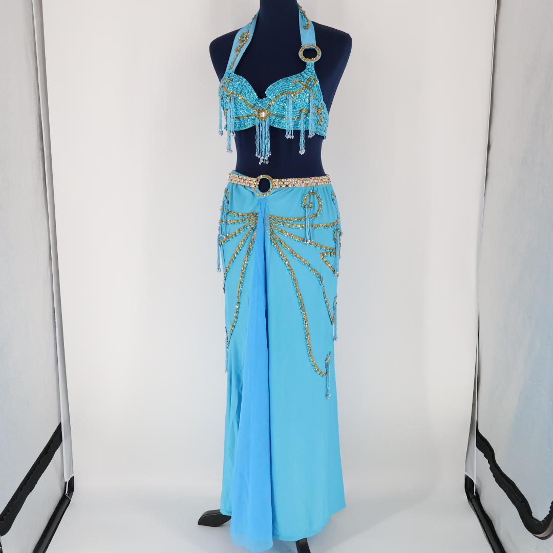 ベリーダンス衣装 ブラ&ベルトセット スパンコールビーズ装飾 ブルーオリエンタル